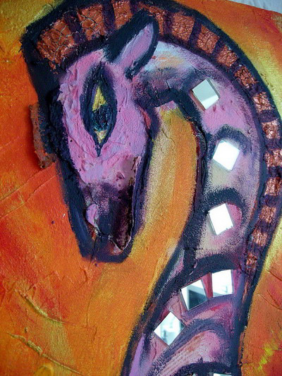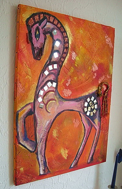 Info zur Technik: Als Inspiration diente eine kleine Bronzestatue, eine Nachbildung eines antiken Ausgrabungsfundes von den Etruskern, die ich aus Piombino /Italien mitbrachte. In dem Bild sind viele Effekte, die man teilweise auf den Detailfotos erkennen kann: Zunächst wurden die groben Züge der Figur in eine Strukturpaste geritzt und hier und da mit diversen Spachteln Strukturen erzeugt. In die Spachtelmasse wurden die Spiegelquadrate eingedrückt. Dann wurde mit Acryl gemalt. Zusätzlich habe ich einen bronzenen "Facettenlack" verwendet, der nach wenigen Stunden aufspringt und Risse zeigt, als wäre er 100 Jahre alt, sowie eine golden schimmernde Bereiche angelegt. Der Schwanz des Pferdes ist ein altes Stück Seil welches ich in einem kleinen Fischerdorf in Beer/England am Strand fand. Zum Schluß habe ich noch hier und da mit Ölpastellkreiden einige einzelne Striche als Akzente gesetzt. |